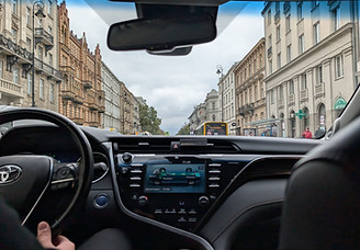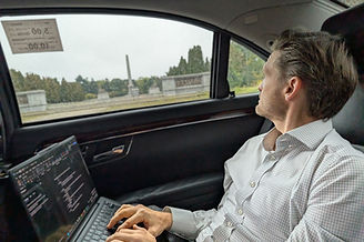 ​Working in a taxi on our way to company meetings in Warsaw
